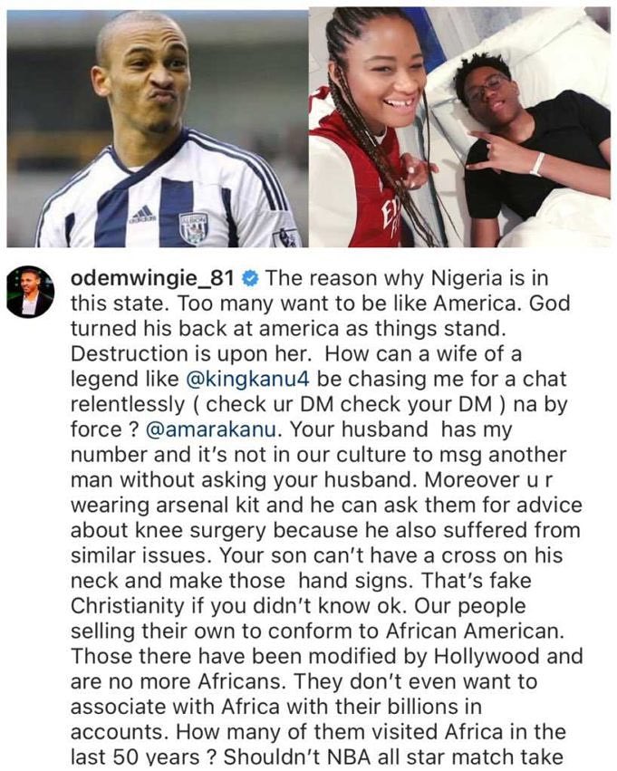 He also called out Amara, Kanu Nwankwo’s wife for chasing him relentlessly. Odemwingie and Kanu were teammates in the super eagles in the 2000s until Kanu’s retirement.