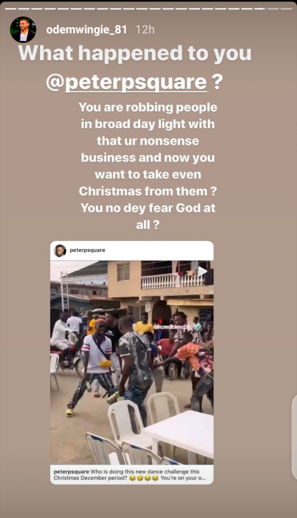 Odemwingie reacted minutes after Peter released a video of two area boys breaking bottles on their head in a kind of new dance with the caption ” Who is doing this new dance challenge this Christmas December period😂😂😂. You are on your own o”.