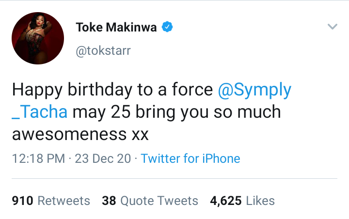 – Celebrities like Toke Makinwa, Dr Sid, and many others wish her a happy birthday.