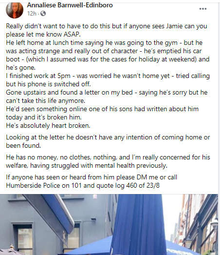 His wife Annaliese appealed to followers on Facebook, urging them to report to her if they have any details about her missing husband.