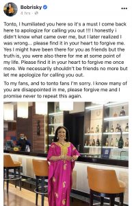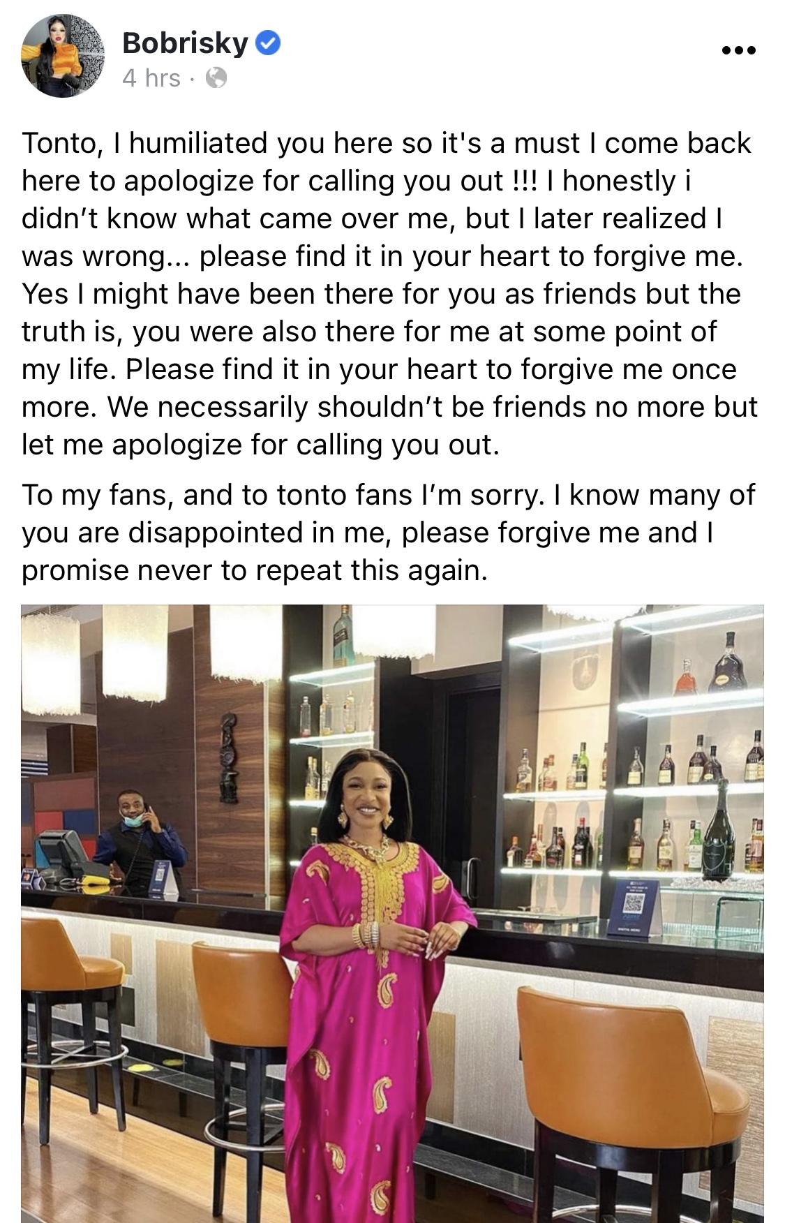 Controversial Nigerian socialite has come on social media to tender a public apology to actress Tonto Dikeh.