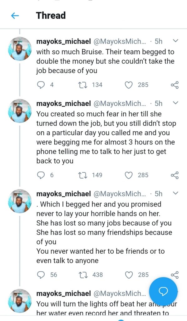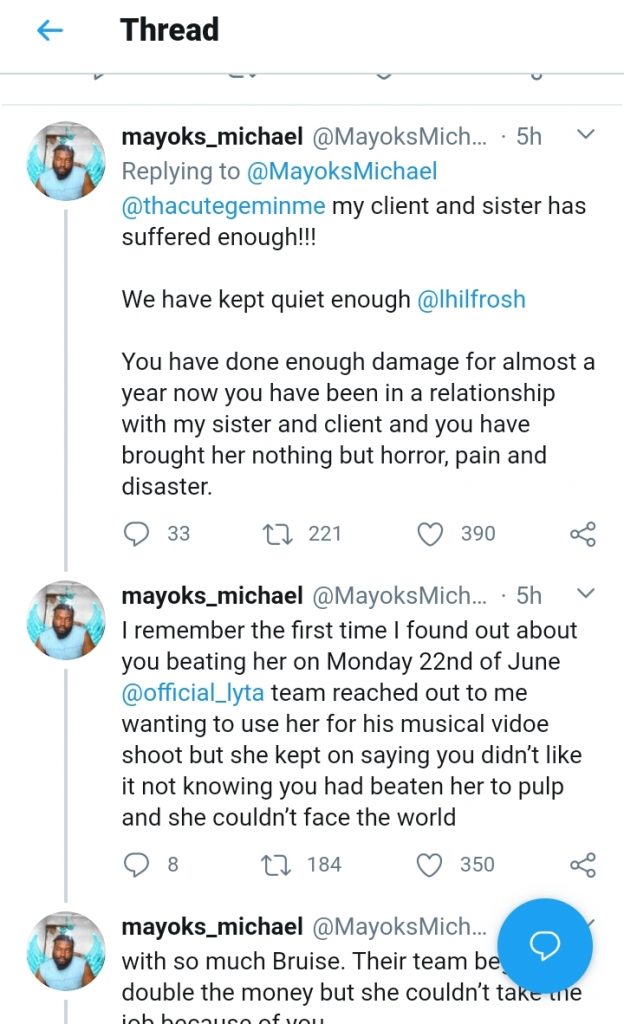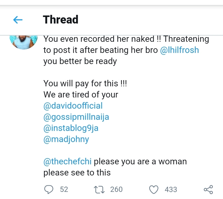 Mayoks Michael who repeated referred to the victim as his client and sister accompanied his accusation with photographs that shows a badly bruised lady. Davido and Lhil Frosh who were tagged to the post are yet to respond to the accusation as at the time of filling this report.