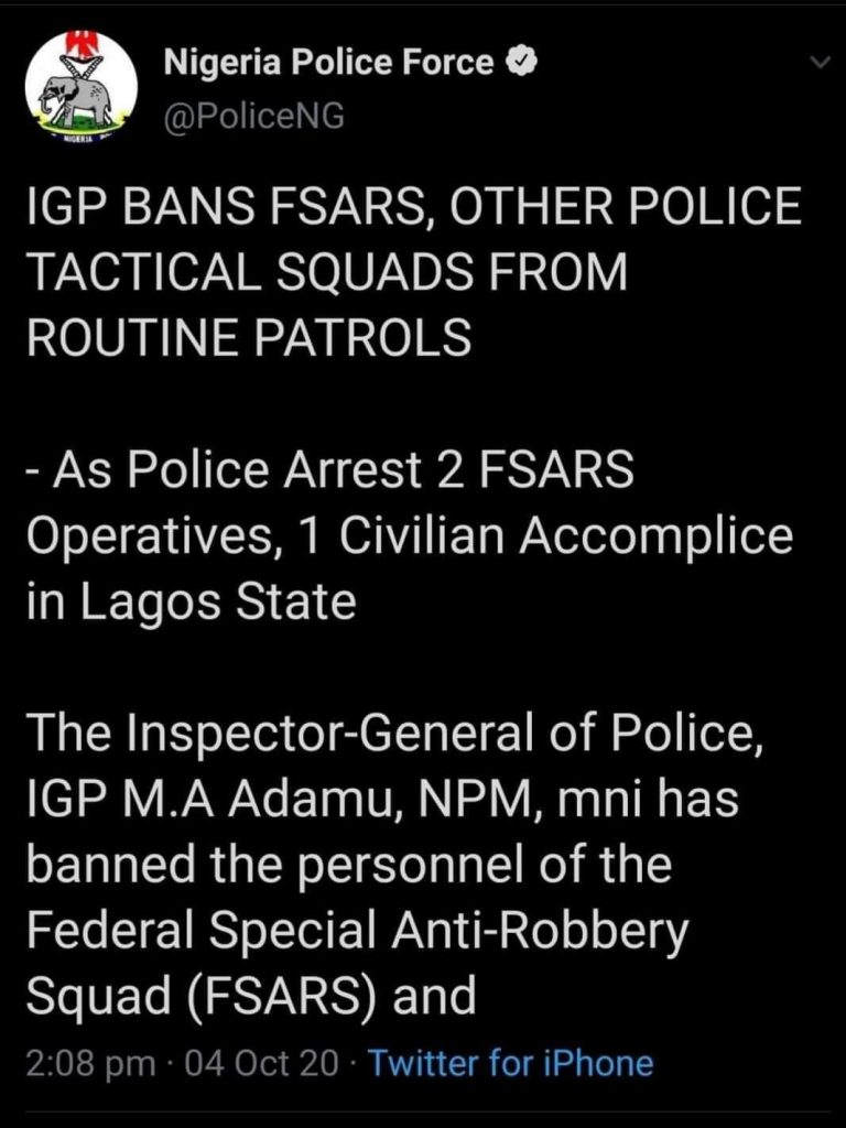 According to the official Twitter handle of the security unit, the IGP gave the order on the heels of public outcry over the unending brutality being perpetrated by SARS operatives daily. The condemnation was ignited with trending hashtags like #EndSarsNow #EnoughisEnough #EndPoliceBrutality #ENDSARSBRUTALITY