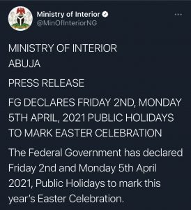 The Federal Government has declared Friday, 2nd, and Monday, 5th of April, public holidays to celebrate this year’s Easter.