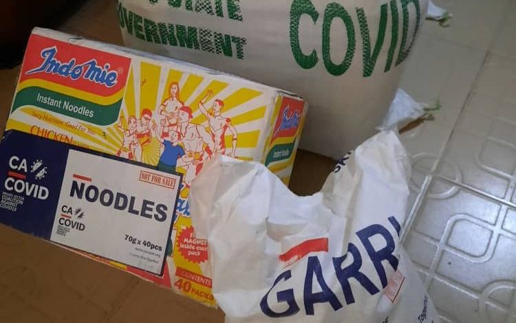 The food items, which were labelled ‘CACOVID, NOT FOR SALE,’ include bags of rice, macaroni, spaghetti, salt, garri, sugar and cartons of noodles.