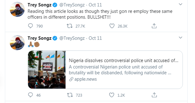 After reposting an article from Apple News title “Nigeria dissolves controversial police unit accused of brutality” with a folded hands and raised fist emoji that showed solidarity and victory, Trey Song few hours later tweet about his concern on how the Nigerian police leadership intends to reform the Special Anti-Robbery Squad.