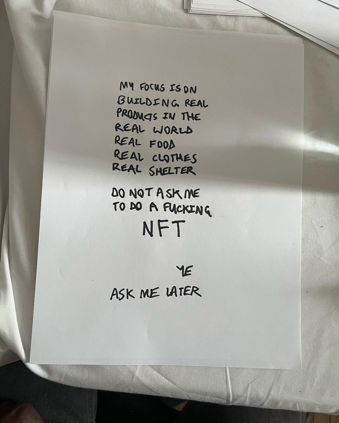 In a post that was sent out to his 10.5 million followers on Instagram yesterday, Ye asked them to stop asking him to do NFTs as he is more interested “For now”.