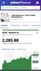 Alphabet stock is currently trading at $2285.88 with a yearly return on investment of 89%.
